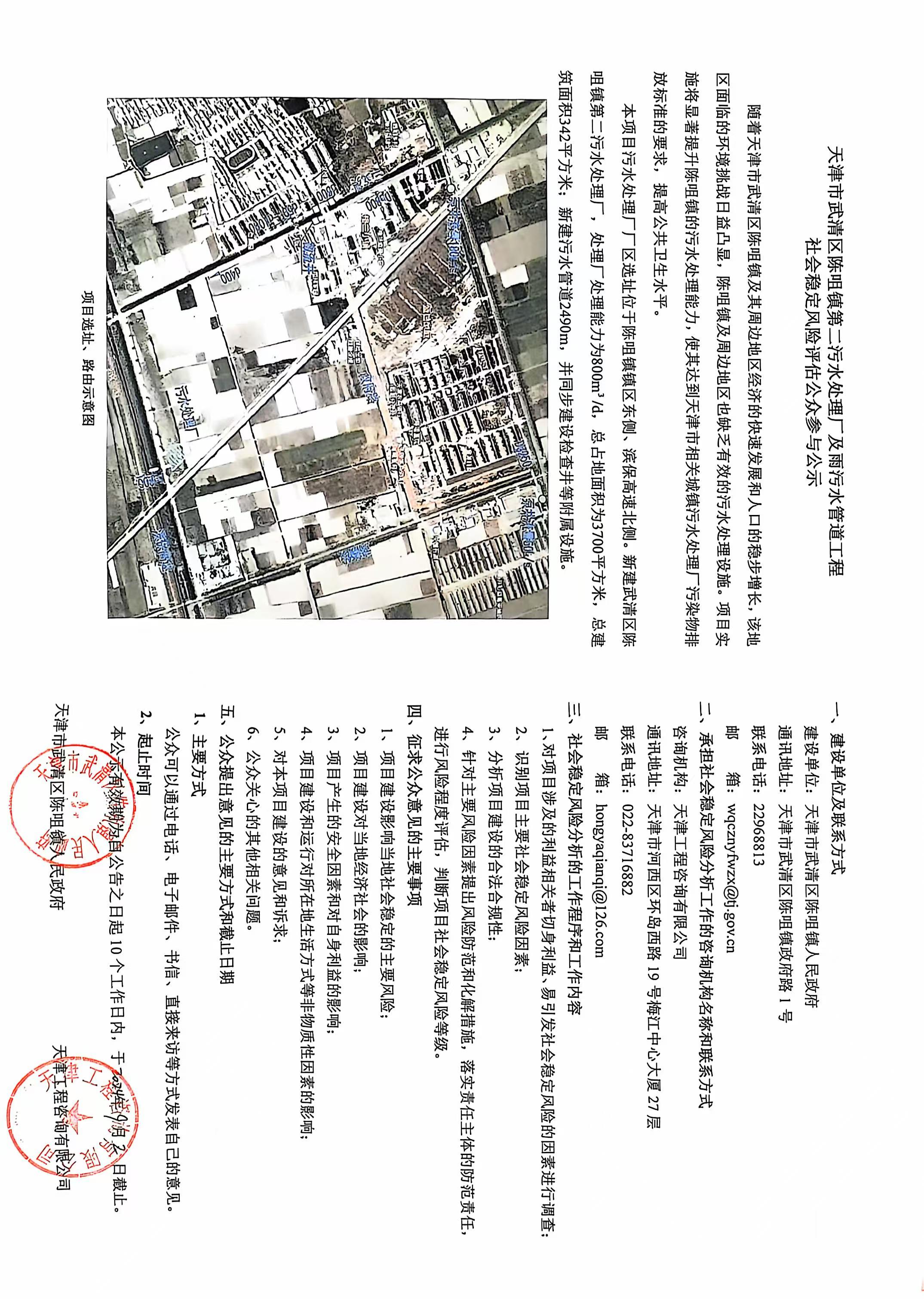 關(guān)于天津市武清區(qū)陳咀鎮(zhèn)第二污水處理廠(chǎng)及雨污水管道工程社會(huì)穩(wěn)定風(fēng)險(xiǎn)評(píng)估公眾參與的公示