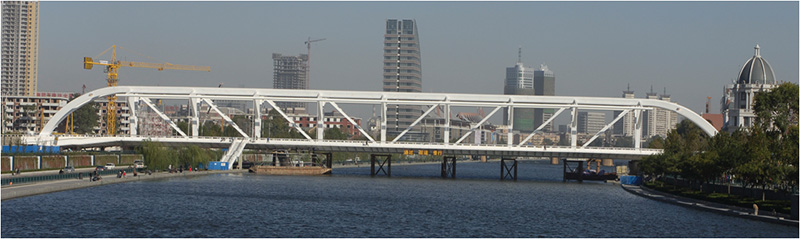該橋橫跨張自忠路、海河以及海河東路。橋梁總長180米,主跨128米,面積4985.2 平米,為自錨式桁吊組合鋼結構橋。總投資2.65億元。該橋梁設計在國內外尚屬首創。